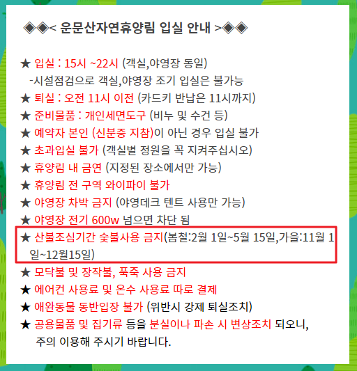 자연휴양림 마다 다 다르다 이곳은 산불조심기간을 제외한 기간에는 숯불만 사용가능하다