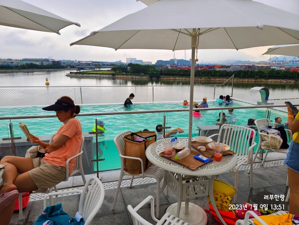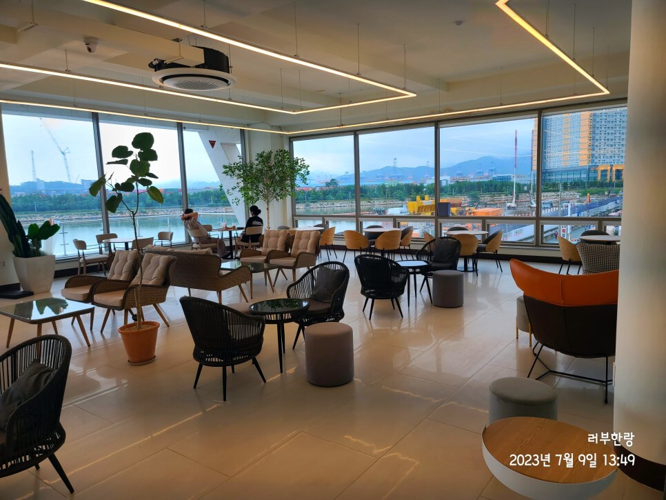 The cafe's size was enormous, and what caught my attention was the impressive bed-style tables. They had plenty of regular tables too! Though there wasn't a particularly breathtaking view, you could see Busan's Noksan Industrial Complex and Busan New Port from afar. Also, there was an under-construction tsunami protection wall, which will likely enhance the view once it's completed.