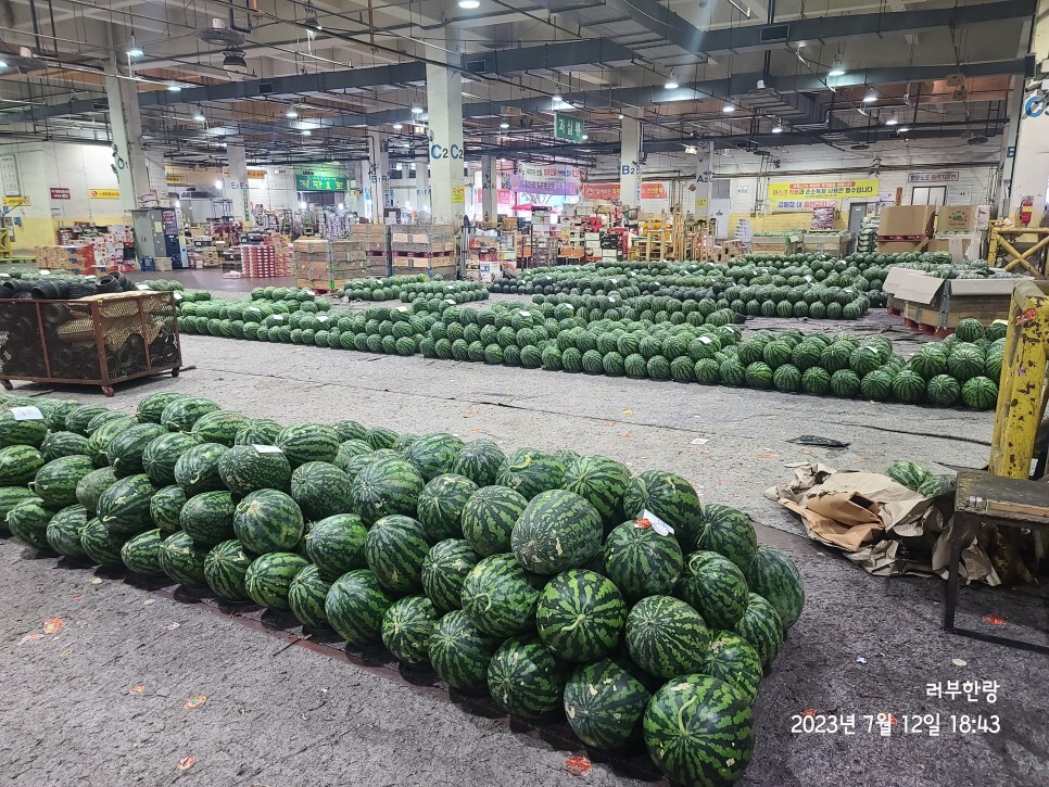 수박뿐만아니라 다양한 제철과일이 그냥 박스로 쌓여있다
