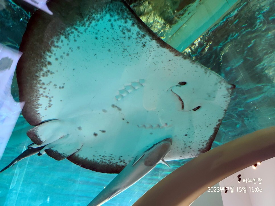 This stingray is the largest specimen. This fellow secretly likes to walk on the tunnel's roof.